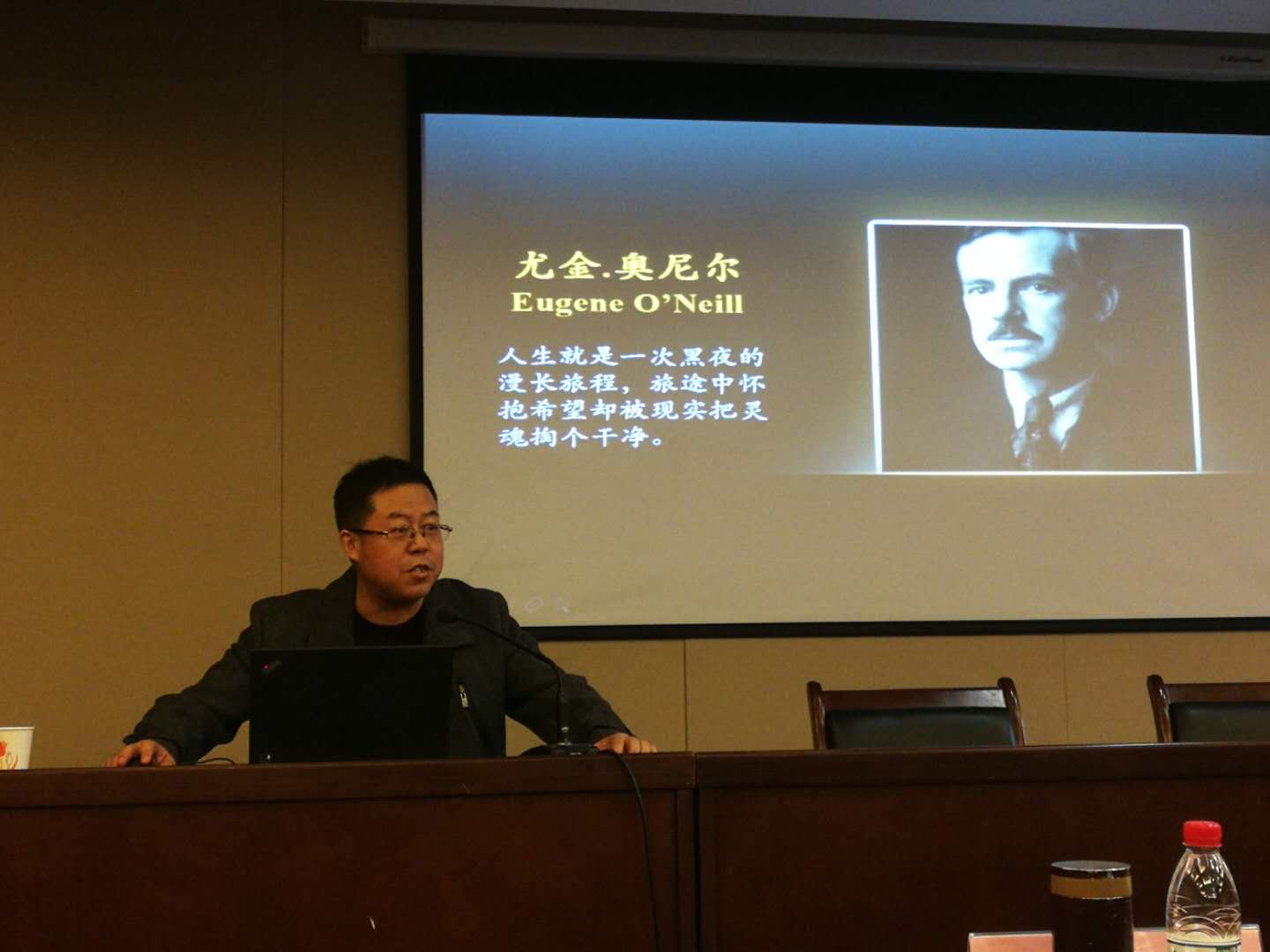 王占斌以 “回归的心路历程——奥尼尔戏剧的回归叙事研究”为题作主题发言。王占斌指出,奥尼尔戏剧的回归叙事,可以概括为海洋叙事、归根叙事、东方叙事、死亡叙事和宗教叙事五个方面,并依次进行了详细解说。主题演讲深入浅出,幽默风趣,受到与会学者广泛好评。